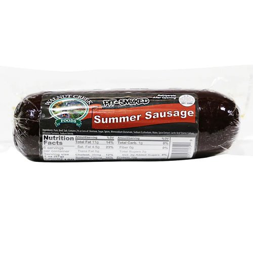 12 oz. Walnut Creek Pit Smoked Summer Sausage. Shelf Stable (Refrigerate after opening) Ingredients: Beef, Salt, Raw Cane Sugar, Citric Acid, Spices, Garlic, Natural Spice Extractives, Sodium Nitrate.