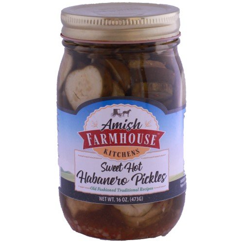 16 oz. Sweet Hot Habanero Pickles bottled by Amish Farmhouse Kitchens. Our very best recipes prepared especially for you.